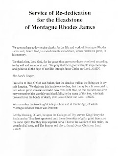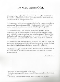 At Rye I found that E.F. Benson's grave is very modest, because the distant relative responsible didn't like him very much, and didn't even bother spelling his name correctly. The EFB Society does its best, but there's only so much that can be done with what amounts to a perfunctory resting place - an afterthought rather than a memorial. By coincidence, the other day I found this reminder of how M.R. James' admirers restored his grave at Eton at the turn of the century. I wasn't there, I hasten to add - but I got the little brochure because I contributed a few bob.